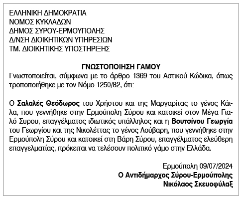 Γνωστοποίηση γάμου για Σαλαλέ Θεόδωρο και Βουτσίνου Γεωργία Κείμενο Βλέπε εικόνα. Αριθμός Φύλλου: 6417 Κατηγορία: Γνωστοποίηση Γάμου