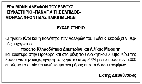 Ευχαριστήριο για δωρεές από το ησυχαστήριο "Παναγία της Ελπίδος" Κείμενο Βλέπε εικόνα. Αριθμός Φύλλου: Αριθμός Φύλλου 6420 Κατηγορία: Κατηγορία Δωρεές