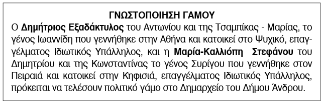 Γνωστοποίηση γάμου για τον Εξαδάκτυλο Δημήτριο και την Στεφάνου Μαρία - Καλλιόπη Κείμενο Βλέπε εικόνα. Αριθμός Φύλλου: 6422 Κατηγορία: Γνωστοποίηση Γάμου