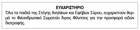 Ευχαριστήριο για δωρεές από τη Στέγη Ανηλίκων και Εφήβων Σύρου Κείμενο Βλέπε εικόνα. Αριθμός Φύλλου: Αριθμός Φύλλου 6446 Κατηγορία: Κατηγορία Δωρεές