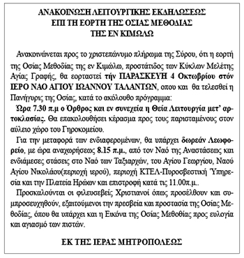 Ανακοίνωση λειτουργικής εκδηλώσεως επί τη εορτή της Οσίας Μεθοδίας της εν Κιμώλω, από την Ιερά Μητρόπολη Σύρου Κείμενο Βλέπε εικόνα. Αριθμός Φύλλου: Αριθμός Φύλλου 6460 Κατηγορία: Κατηγορία Ανακοίνωση