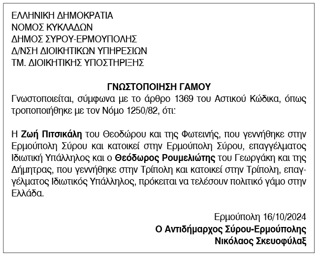 Γνωστοποίηση γάμου για Ζωή Πιτσικάλη και Θεόδωρο Ρουμελιώτη Κείμενο Βλέπε εικόνα. Αριθμός Φύλλου: Αριθμός Φύλλου 6472 Κατηγορία: Κατηγορία Γνωστοποίηση Γάμου