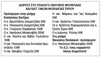 Ευχαριστήριο για δωρεές από το Σύλλογο Παροχής Φροντίδας και Κατ' Οίκον Νοσηλείας Σύρου Κείμενο Βλέπε εικόνα. Αριθμός Φύλλου: Αριθμός Φύλλου 6552 Κατηγορία: Κατηγορία Δωρεές