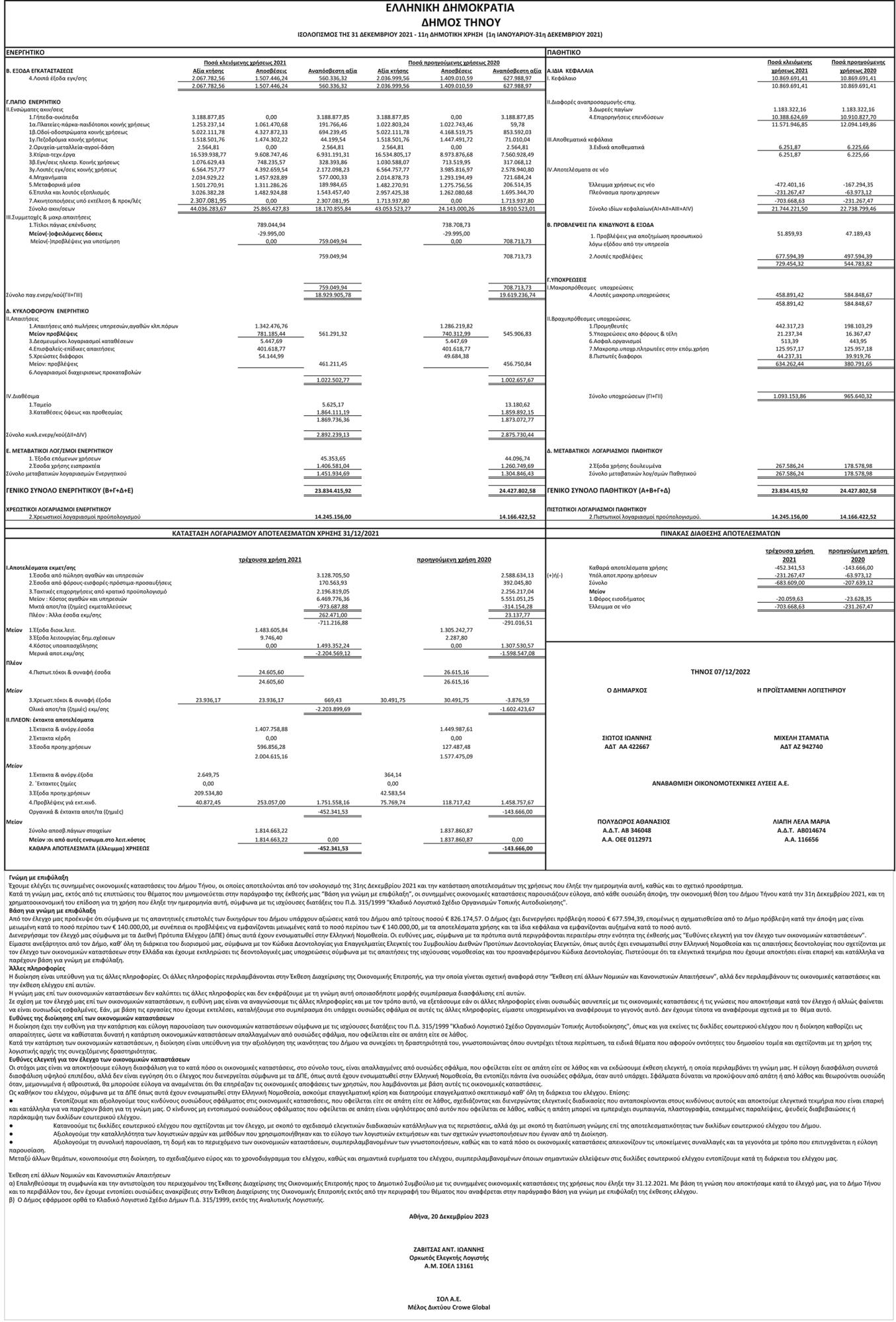 Ισολογισμός 2021, από το Δήμο Τήνου Κείμενο Βλέπε εικόνα. Αριθμός Φύλλου: Αριθμός Φύλλου 6554 Κατηγορία: Κατηγορία Ισολογισμοί
