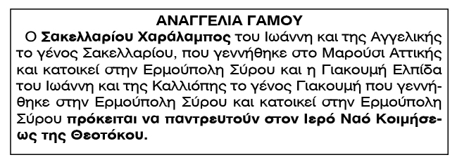 Αναγγελία Γάμου Κείμενο Βλέπε εικόνα Αριθμός Φύλλου: Αριθμός Φύλλου 4807 Κατηγορία: Κατηγορία Αναγγελία Γάμου
