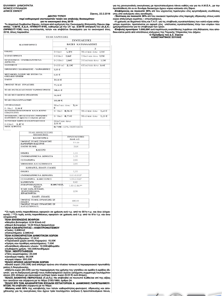 Δελτίο Τύπου περί καθορισμού συντελεστών τελών και επιβολής δικαιωμάτων για το οικονομικό έτος 2018 Κείμενο Βλέπε εικόνα Αριθμός Φύλλου: Αριθμός Φύλλου 4826 Κατηγορία: Κατηγορία Ανακοίνωση