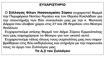 Ευχαριστήριο Συλλόγου Φίλων Νοσοκομείου Σύρου Κείμενο Βλέπε εικόνα Αριθμός Φύλλου: Αριθμός Φύλλου 4869 Κατηγορία: Κατηγορία Ευχαριστήριο
