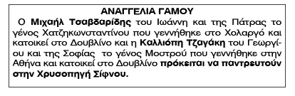 Αναγγελία Γάμου Τσαβδαρίδη Μιχαήλ και Τζαγκάκη Καλλιόπης Κείμενο Βλέπε εικόνα Αριθμός Φύλλου: Αριθμός Φύλλου 4887 Κατηγορία: Κατηγορία Αναγγελία Γάμου