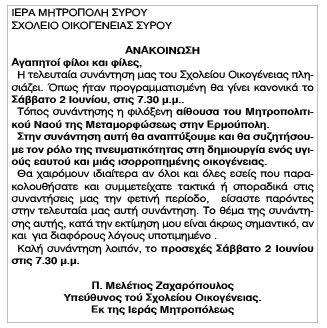 Σχολείο Οικογένειας Σύρου Κείμενο Βλέπε εικόνα Αριθμός Φύλλου: Αριθμός Φύλλου 4888 Κατηγορία: Κατηγορία Ανακοίνωση