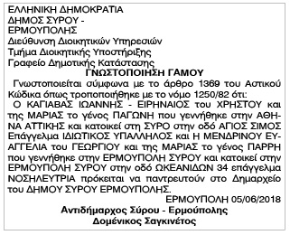 Γνωστοποίηση Γάμου Καγιαβά Ιωάννη - Ειρηναίου και Μενδρινού Ευαγγελίας Κείμενο Βλέπε εικόνα Αριθμός Φύλλου: Αριθμός Φύλλου 4892 Κατηγορία: Κατηγορία Γνωστοποίηση Γάμου