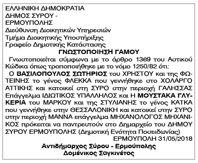 Γνωστοποίηση Γάμου Βασιλόπουλου Σωτήριου και Μουστάκα Γκυκερίας Κείμενο Βλέπε εικόνα Αριθμός Φύλλου: Αριθμός Φύλλου 4893 Κατηγορία: Κατηγορία Γνωστοποίηση Γάμου