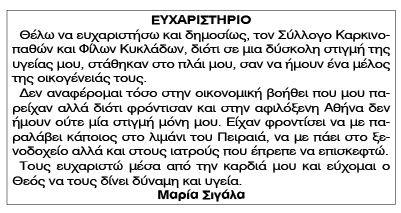 Ευχαριστήριο Μαρίας Σιγάλα Κείμενο Βλέπε εικόνα Αριθμός Φύλλου: Αριθμός Φύλλου 4896 Κατηγορία: Κατηγορία Ευχαριστήριο