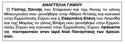 Αναγγελία Γάμου Γούτη Ζαννή και Ζαρμπώνη Ελένη Κείμενο Βλέπε εικόνα Αριθμός Φύλλου: Αριθμός Φύλλου 4896 Κατηγορία: Κατηγορία Αναγγελία Γάμου