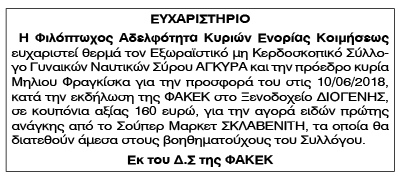 Ευχαριστήριο της Φιλοπτώχου Αδελφότητας Κυριών Ενορίας Κοιμήσεως Κείμενο Βλέπε εικόνα Αριθμός Φύλλου: Αριθμός Φύλλου 4898 Κατηγορία: Κατηγορία Ευχαριστήριο