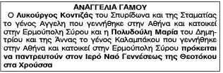 Αναγγελία Γάμου Κοντιζά Λυκούργου και Πολυδούλη Μαρίας Κείμενο Βλέπε εικόνα Αριθμός Φύλλου: Αριθμός Φύλλου 4901 Κατηγορία: Κατηγορία Αναγγελία Γάμου