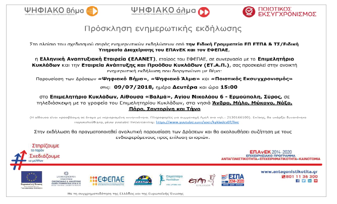 Ενημερωτική εκδήλωση για χρηματοδοτικά προγράμματα Κείμενο Βλέπε εικόνα Αριθμός Φύλλου: Αριθμός Φύλλου 4911 Κατηγορία: Κατηγορία Πρόσκληση