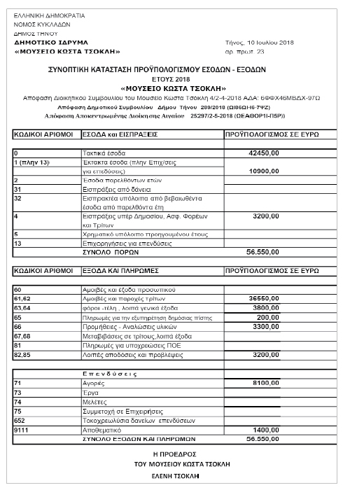 Συνοπτική κατάσταση προϋπολογισμού εσόδων - εξόδων έτους 2018 Μουσείο Κώστα Τσόκλη Κείμενο Βλέπε εικόνα Αριθμός Φύλλου: 4918 Κατηγορία: Προϋπολογισμοί