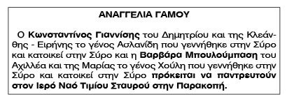 Αναγγελία Γάμου Κωνσταντίνου Γιαννίση και Βαρβάρας Μπουλούμπαση Κείμενο Βλέπε εικόνα Αριθμός Φύλλου: Αριθμός Φύλλου 4926 Κατηγορία: Κατηγορία Αναγγελία Γάμου