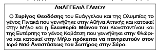 Αναγγελία Γάμου Συρίγου Θεοδόση και Ελευθερίας Μάινου Κείμενο Βλέπε εικόνα Αριθμός Φύλλου: 4927 Κατηγορία: Αναγγελία Γάμου