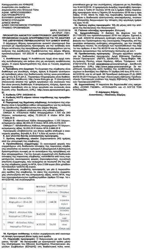 Προμήθεια κάδων απορριμμάτων για τις ανάγκες της διεύθυνσης περιβάλλοντος του Δήμου Θήρας Κείμενο Βλέπε εικόνα Αριθμός Φύλλου: 4932 Κατηγορία: Περιλήψεις