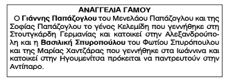 Αναγγελία Γάμου Γιάννη Παπάζογλου και Βασιλικής Σπυροπούλου Κείμενο Βλέπε εικόνα Αριθμός Φύλλου: 4941 Κατηγορία: Αναγγελία Γάμου