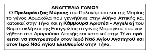 Αναγγελία Γάμου Πρελορέντζου Μάρκου και Κάββουρα Αριστέας Κείμενο Βλέπε εικόνα Αριθμός Φύλλου: 4947 Κατηγορία: Αναγγελία Γάμου