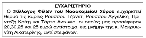 Ευχαριστήριο του Συλλόγου Φίλων του Νοσοκομείου Σύρου Κείμενο Βλέπε εικόνα Αριθμός Φύλλου: Αριθμός Φύλλου 4950 Κατηγορία: Κατηγορία Ευχαριστήριο