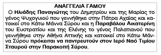 Αναγγελία Γάμου Ηλιάδη Παναγιώτη και Παραβάλου Αικατερίνης Κείμενο Βλέπε εικόνα Αριθμός Φύλλου: Αριθμός Φύλλου 4955 Κατηγορία: Κατηγορία Αναγγελία Γάμου