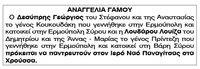 Αναγγελία Γάμου Δεσύπρη Γεωργίου και Λουδάρου Λουΐζας Κείμενο Βλέπε εικόνα Αριθμός Φύλλου: Αριθμός Φύλλου 4969 Κατηγορία: Κατηγορία Αναγγελία Γάμου