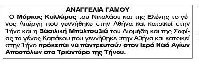 Αναγγεία Γάμου Μάρκου Κολλάρου και Βασιλικής Μπαλτσαβιά Κείμενο Βλέπε εικόνα Αριθμός Φύλλου: Αριθμός Φύλλου 4979 Κατηγορία: Κατηγορία Αναγγελία Γάμου