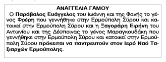 Αναγγελία Γάμου Ευάγγελου Παράβαλου και Ειρήνης Ξαγοράρη Κείμενο Βλέπε εικόνα Αριθμός Φύλλου: Αριθμός Φύλλου 4981 Κατηγορία: Κατηγορία Αναγγελία Γάμου
