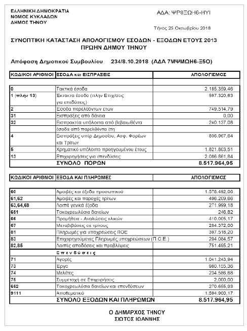 Συνοπτική κατάσταση Απολογισμού εσόδων - εξόδων έτους 2013 Πρώην Δήμου Τήνου Κείμενο Βλέπε εικόνα Αριθμός Φύλλου: Αριθμός Φύλλου 4994 Κατηγορία: Κατηγορία Απολογισμός