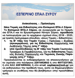 Νέοι Τομείς και Ειδικότητες στο Εσπερινό ΕΠΑ.Λ Σύρου Κείμενο Βλέπε εικόνα Αριθμός Φύλλου: Αριθμός Φύλλου 5002 Κατηγορία: Κατηγορία Ανακοίνωση