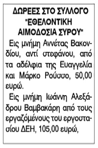 Δωρεές στο Σύλλογο "Εθελοντική Αιμοδοσία Σύρου" Κείμενο Βλέπε εικόνα Αριθμός Φύλλου: Αριθμός Φύλλου 5008 Κατηγορία: Κατηγορία Δωρεές