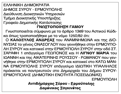 Γνωστοποίηση Γάμου Καλόξυλου Ανδρέα και Λιγνού Μαρίας Κείμενο Βλέπε εικόνα Αριθμός Φύλλου: 5014 Κατηγορία: Γνωστοποίηση Γάμου