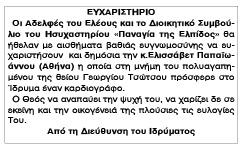 Ευχαριστήριο Ησυχαστηρίου Αδελφών του Ελέους Κείμενο Βλέπε εικόνα Αριθμός Φύλλου: 5017 Κατηγορία: Ευχαριστήριο