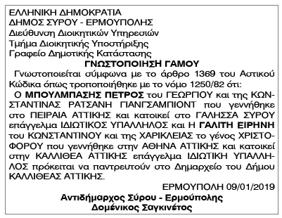 Γνωστοποίηση Γάμου Μπούλμπαση Πέτρου - Γαλίτη Ειρήνης Κείμενο Βλέπε εικόνα Αριθμός Φύλλου: 5042 Κατηγορία: Γνωστοποίηση Γάμου