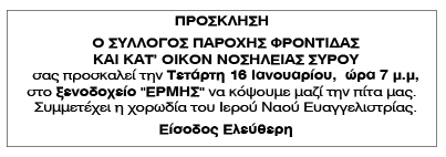 Πρόσκληση Συλλόγου Παροχής Φροντίδας και Κατ' Οίκον Νοσηλειάς Κείμενο Βλέπε εικόνα Αριθμός Φύλλου: Αριθμός Φύλλου 5044 Κατηγορία: Κατηγορία Πρόσκληση