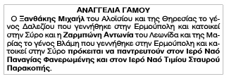 Αναγγελία Γάμου Ξανθάκη Μιχαήλ και Ζαρμπώνη Αντωνίας Κείμενο Βλέπε εικόνα Αριθμός Φύλλου: 5059 Κατηγορία: Αναγγελία Γάμου