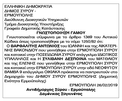 Γνωστοποίηση Γάμου Βαρθαλίτη Αντωνίου και Συλιβάνη Δέσποινας Κείμενο Βλέπε εικόνα Αριθμός Φύλλου: 5075 Κατηγορία: Γνωστοποίηση Γάμου