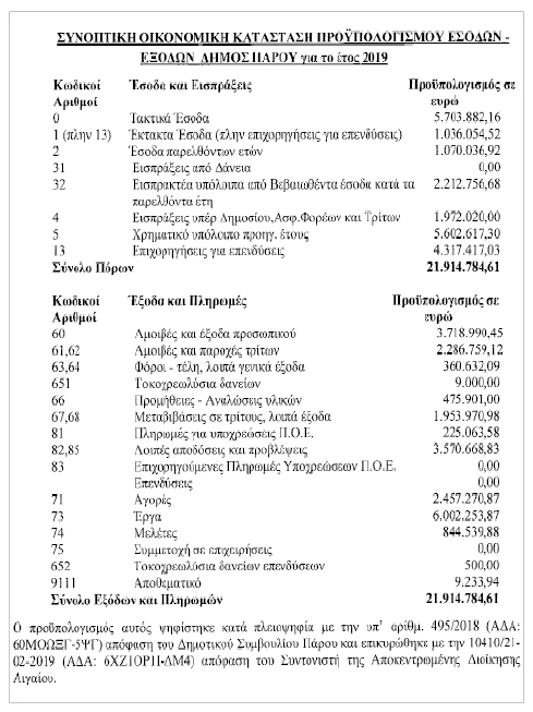Συνοπτική Κατάσταση Προϋπολογισμού Εσόδων - Εξόδων Δήμου Πάρου έτους 2019 Κείμενο Βλέπε εικόνα Αριθμός Φύλλου: 5083 Κατηγορία: Προϋπολογισμοί