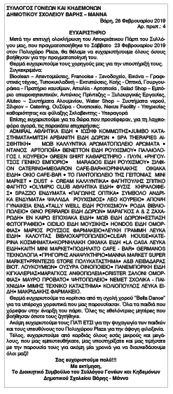 Ευχαριστήριο Συλλόγου Γονέων & Κηδεμόνων Δημοτικού Σχολείου Βάρης - Μάννα Κείμενο Βλέπε εικόνα Αριθμός Φύλλου: 5086 Κατηγορία: Ευχαριστήριο