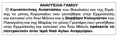 Αναγγελία Γάμου Κωνσταντίνου Αναστασίου και Καλυμιώτου Βαρβάρας Κείμενο Βλέπε εικόνα Αριθμός Φύλλου: 5088 Κατηγορία: Αναγγελία Γάμου