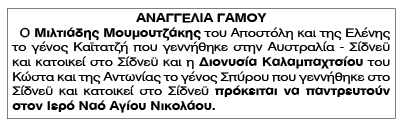 Αναγγελία Γάμου Μουμουτζάκη Μιλτιάδη και Καλαμπαχτασίου Διονυσίας Κείμενο Βλέπε εικόνα Αριθμός Φύλλου: 5088 Κατηγορία: Αναγγελία Γάμου