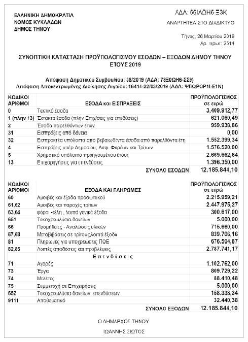 Συνοπτική Κατάσταση Προϋπολογισμού Εσόδων - Εξόδων έτους 2019 Δήμου Τήνου Κείμενο Βλέπε εικόνα Αριθμός Φύλλου: Αριθμός Φύλλου 5095 Κατηγορία: Κατηγορία Προϋπολογισμοί