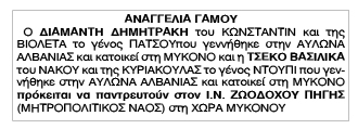 Αναγγελία Γάμου Διαμαντή Δημητράκη και Βασιλικής Τσέκο Κείμενο Βλέπε εικόνα Αριθμός Φύλλου: 5101 Κατηγορία: Αναγγελία Γάμου