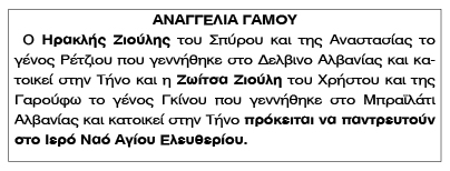 Αναγγελία Γάμου Ζιούλη Ηρακλή και Ζιούλη Ζωίτσας Κείμενο Βλέπε εικόνα Αριθμός Φύλλου: 5108 Κατηγορία: Αναγγελία Γάμου