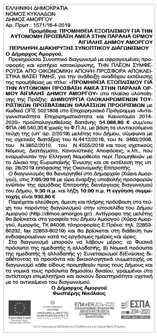 Προμήθεια εξοπλισμού για την αυτόνομη πρόσβαση ΑΜΕΑ στην παραλία Όρμου Αιγιάλης Δήμου Αμοργού Κείμενο Βλέπε εικόνα Αριθμός Φύλλου: 5109 Κατηγορία: Προκήρυξη Έργων - Δημοπρασίες