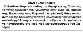 Αναγγελία γάμου Νικόλαου Κυριακόπουλου και Ευφρατώ - Μαρίας Χατζηδάκη Κείμενο Βλέπε εικόνα Αριθμός Φύλλου: 5113 Κατηγορία: Αναγγελία Γάμου