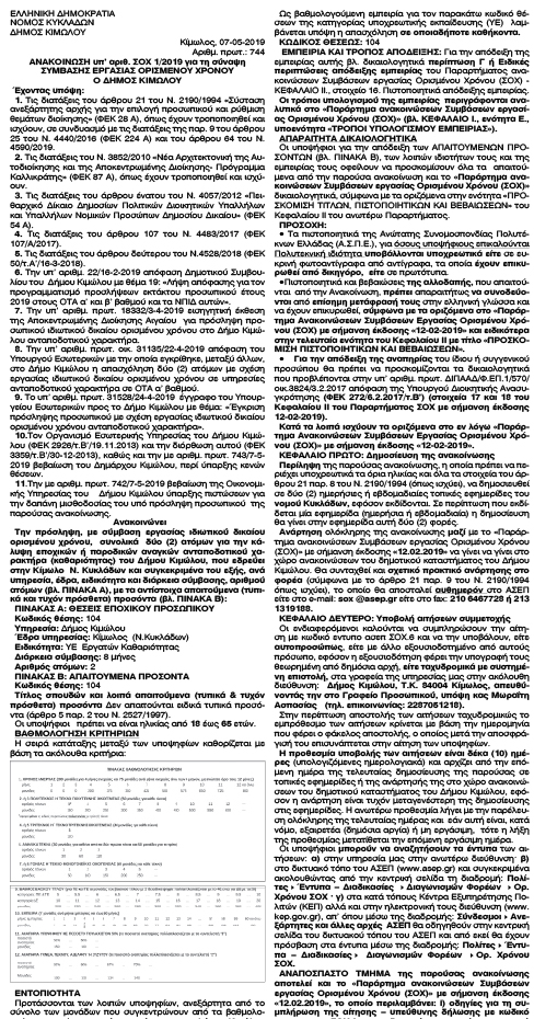 Ανακοίνωση υπ' αριθ. ΣΟΧ 1/2019 Δήμου Κιμώλου Κείμενο Βλέπε εικόνα Αριθμός Φύλλου: Αριθμός Φύλλου 5143 Κατηγορία: Κατηγορία Προκήρυξη Θέσεων